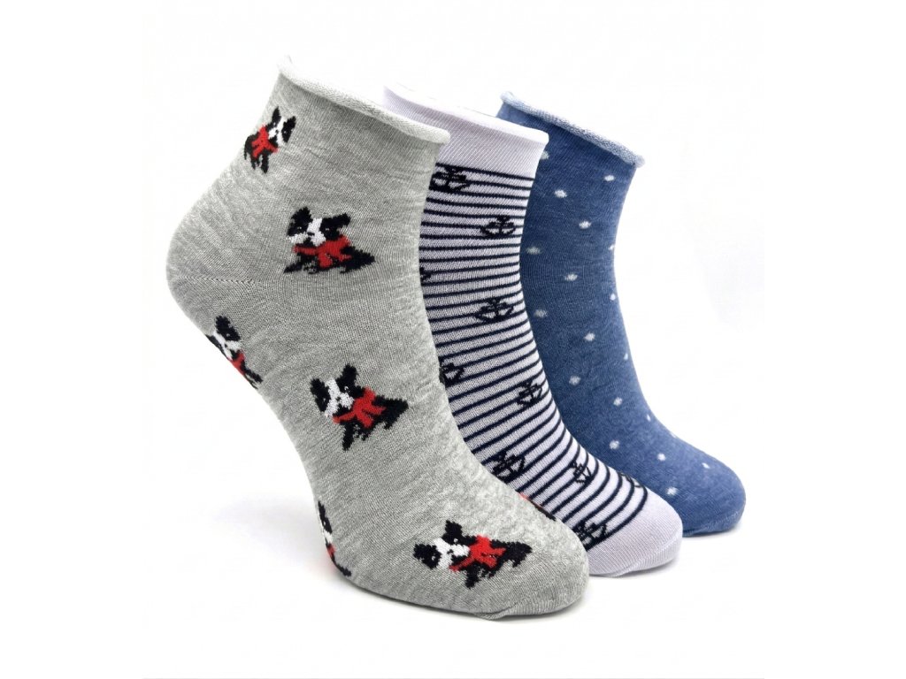 Dámské kotníkové ponožky 3-pack puntík/pes/bílý pruh