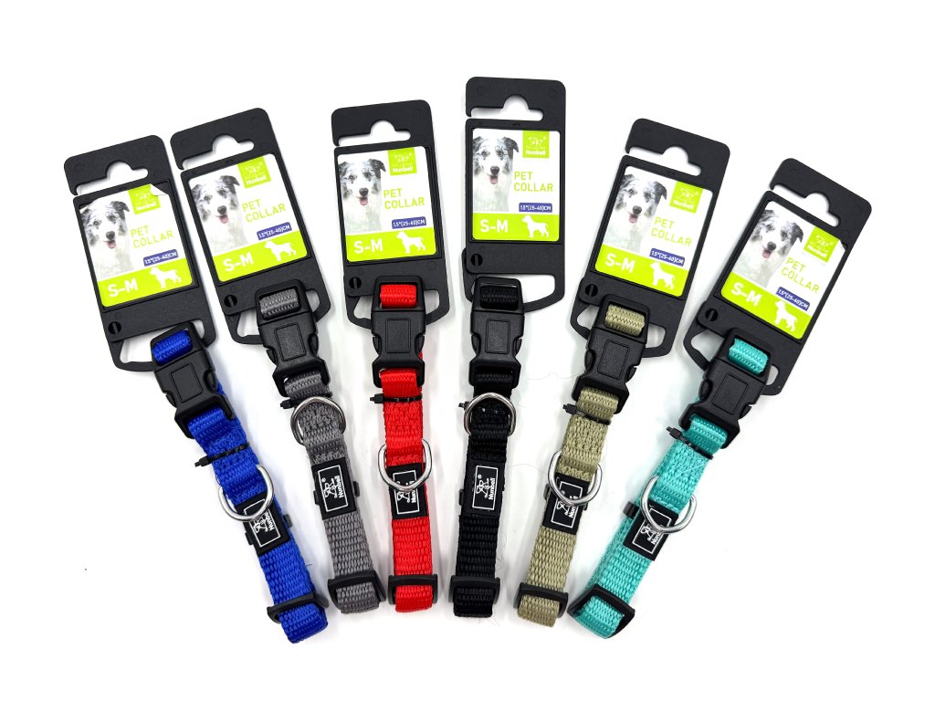 Nylonový obojek s plastovou sponou. Nastavitelná délka popruhu.