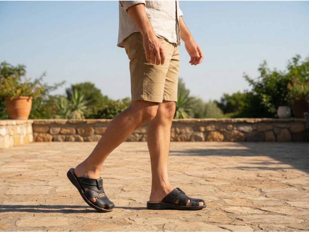 Lehká a pohodlná pánská obuv pro běžné nošení. Pantofle jsou navrženy tak, aby perfektně seděly na noze a poskytovaly optimální pohodlí při každém kroku. Stélka je vyrobena z imitace kůže.