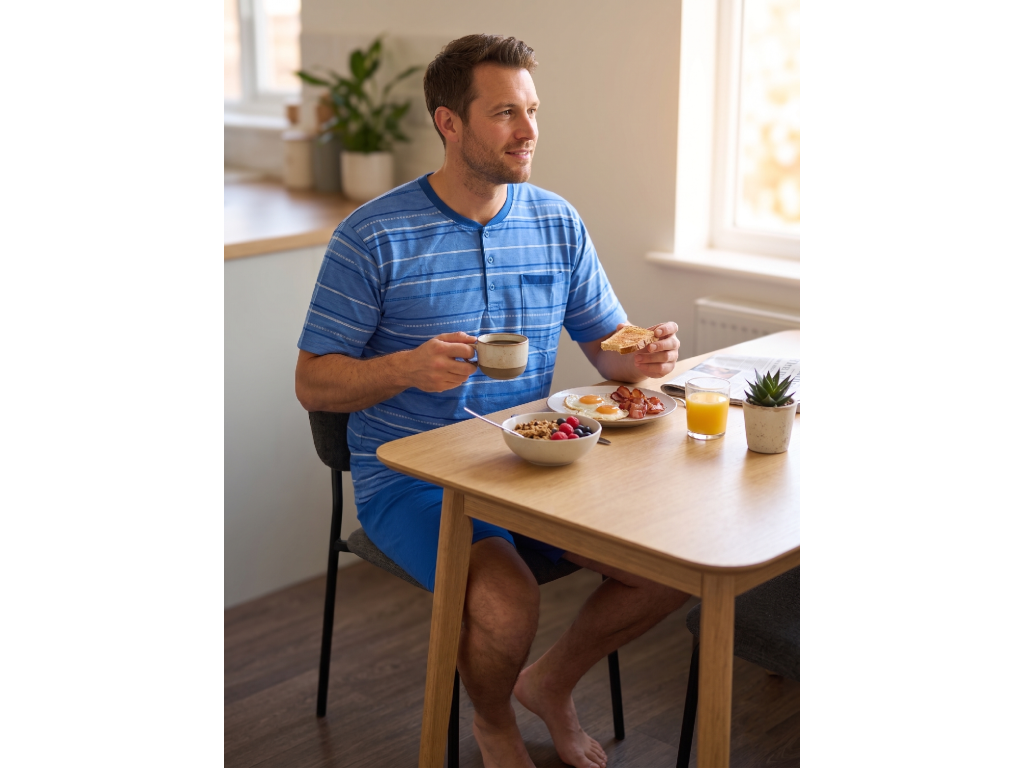 Pánské pyžamo s kulatým výstřihem a zapínáním na knoflíky. Kraťasy s pružným pasem.